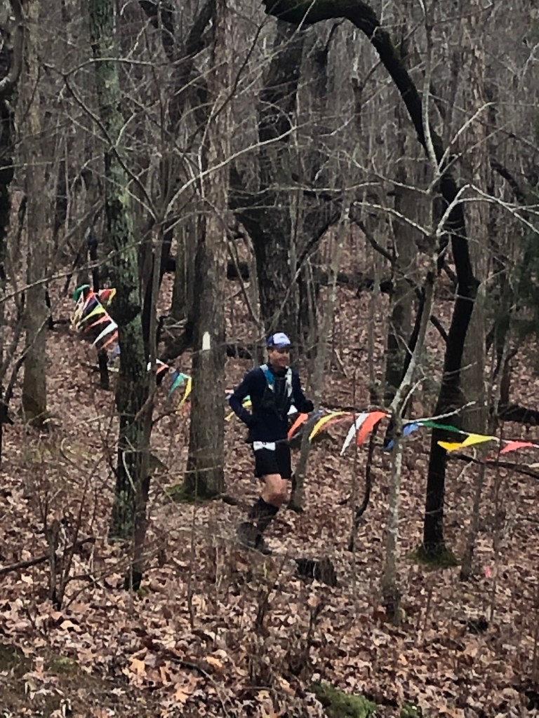 Then I made a mistake. I came across a deep creek crossing that required me to get off the trail and locate another path across. On the way out, I had stopped and surveyed my options. On the way back, I just trudged forward. I also came across a dozen hikers at this exact moment, who were cheering me on. So off I went…with another 40 miler on my tail. About 100 yards onto this trail, I looked through the woods and saw two 20 milers running along the creek on an entirely different trail. Thankfully at that very moment, I realized I was on the wrong trail and had taken another runner off course. Had I not seen those other two runners, it is very likely I would still be out there looking for the finish. Back tracking ever so slightly, I got back on the trail and began to run the 3rd half-marathon.